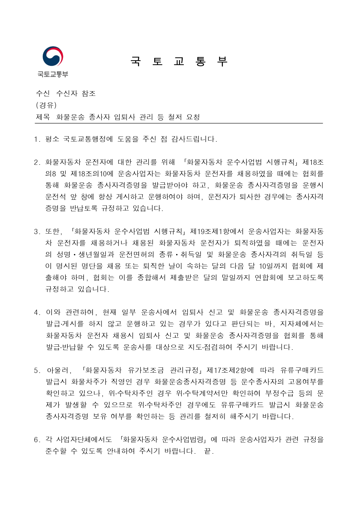 화물운송 종사자 입퇴사 관리 등 철저 안내
