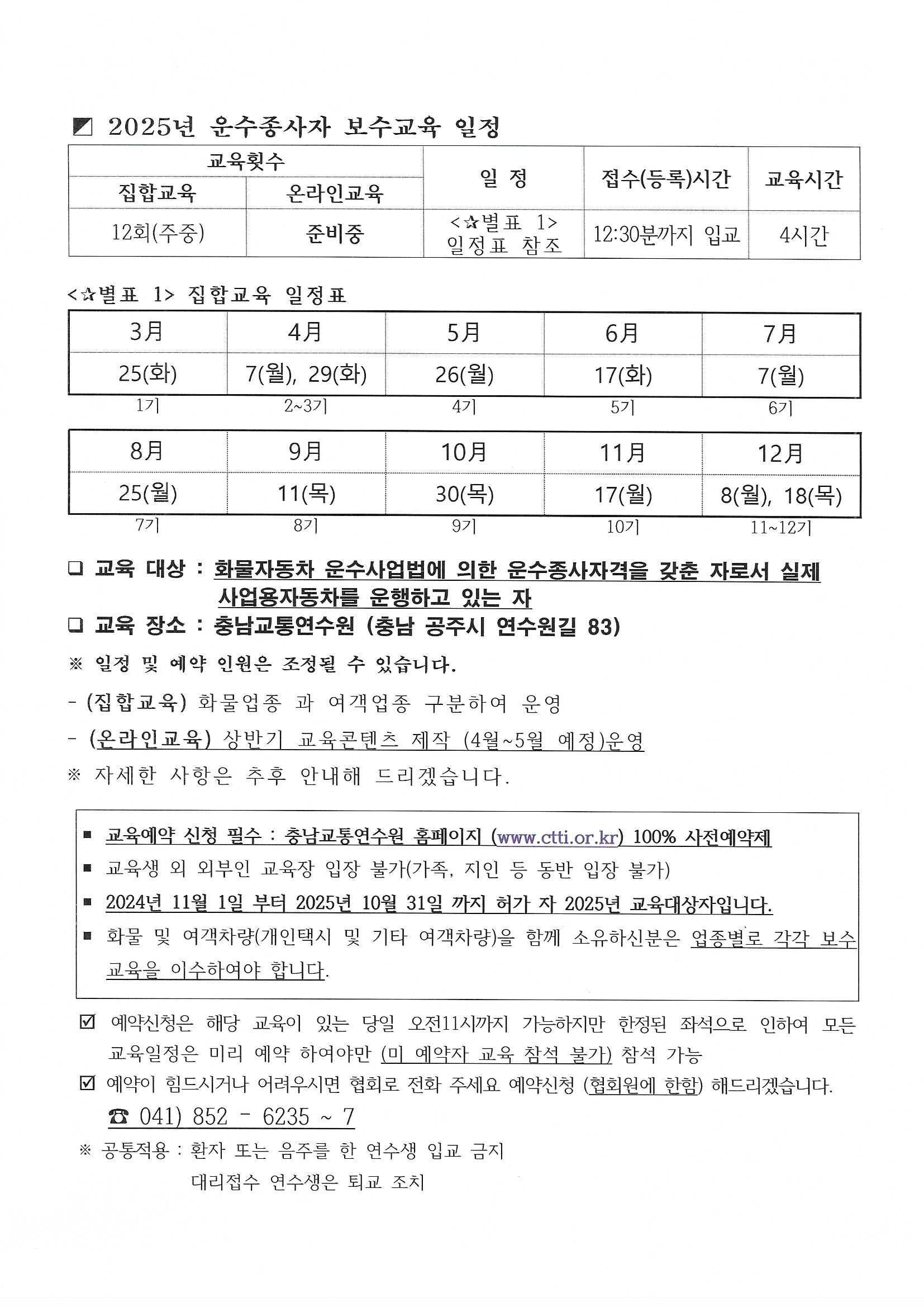 2025년 운수종사자 보수교육 (위험물질 운송차량 운전자교육) 일정