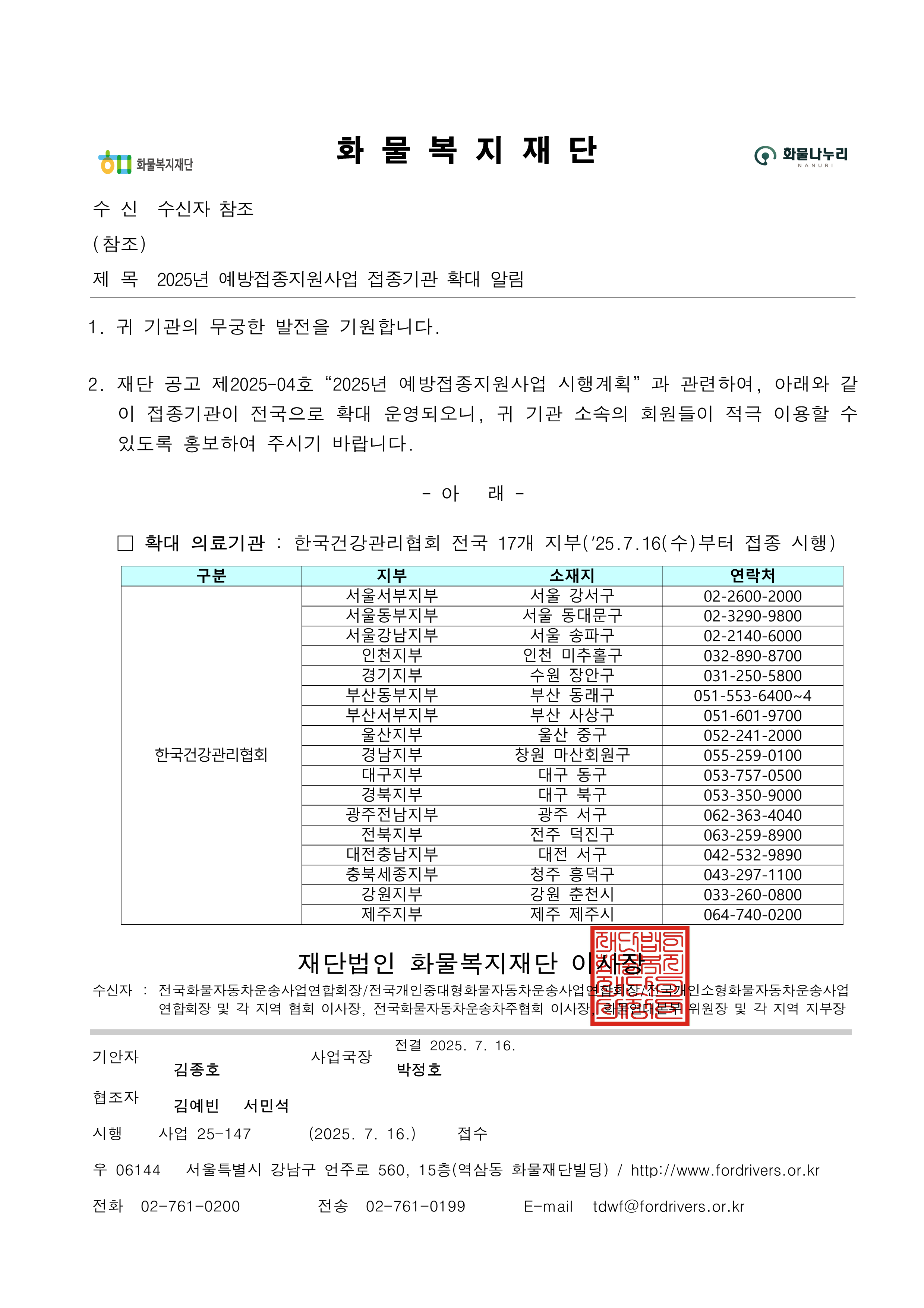 화물복지재단 예방접종지원사업 접종기관 확대 알림