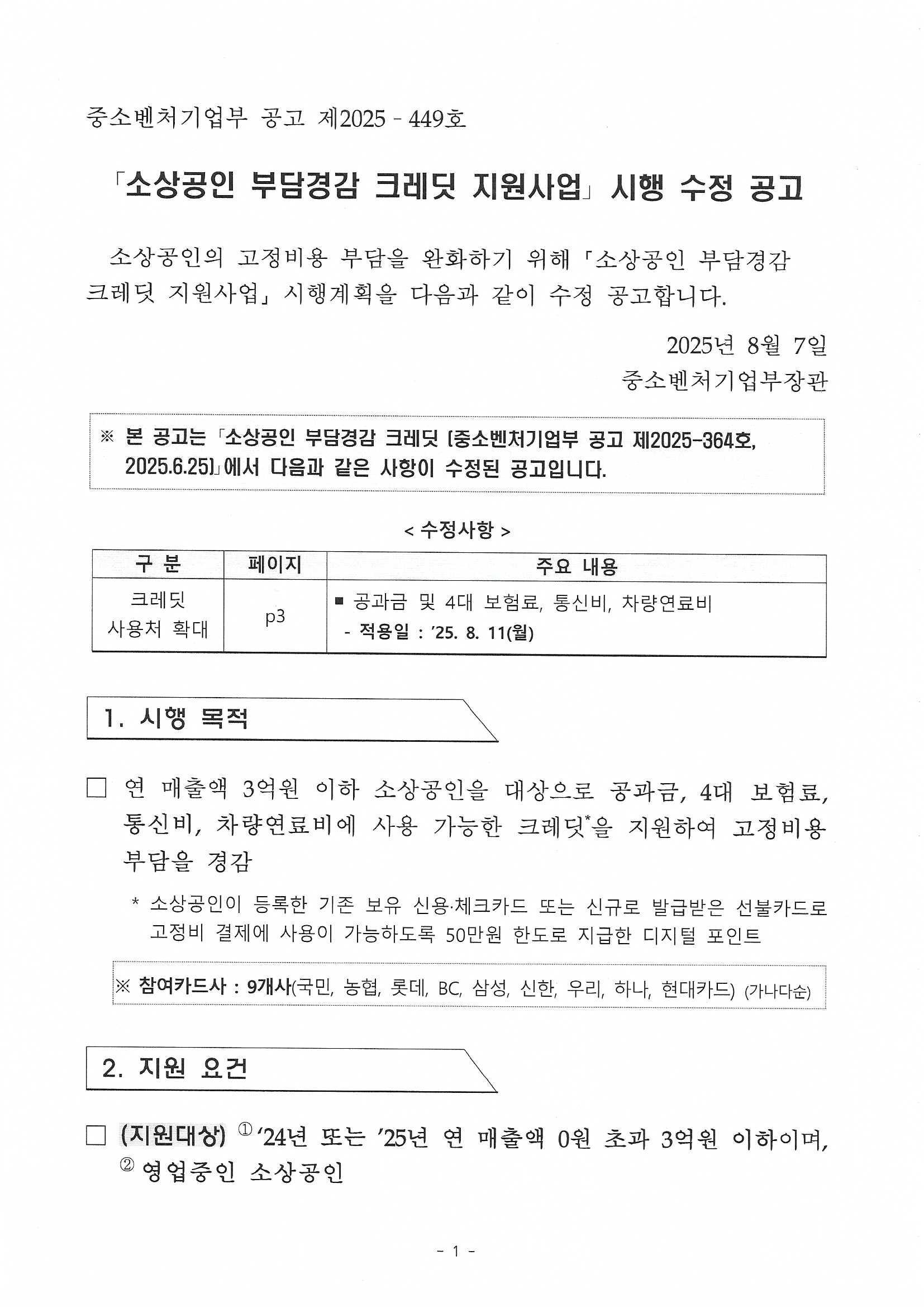 소상공인 부담경감 크레딧 지원사업 시행 공고(수정)