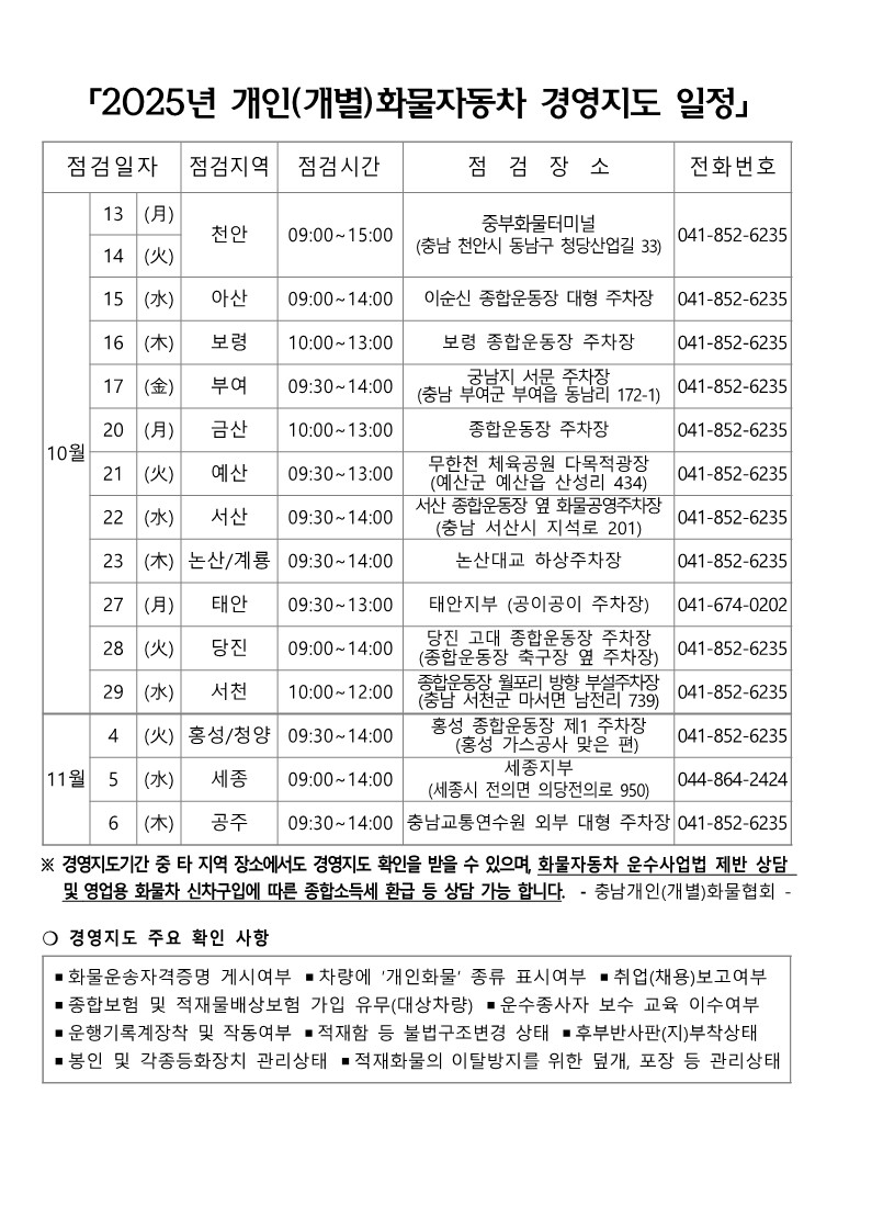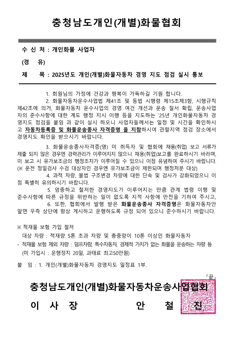 2025년도 개인(개별)화물자동차 경영 지도 점검 실시 통보